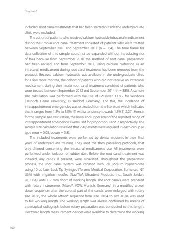 Chapter 6100included. Root canal treatments that had been started outside the undergraduate clinic were excluded. The cohort of patients who received calcium hydroxide intracanal medicament during their molar root canal treatment consisted of patients who were treated between September 2010 and September 2011 (n = 334). The time frame for data collection of this sample could not be expanded without introducing risk of bias because from September 2010, the method of root canal preparation had been revised, and from September 2011, using calcium hydroxide as an intracanal medicament during root canal treatment had been removed from the protocol. Because calcium hydroxide was available in the undergraduate clinic for a few more months, the cohort of patients who did not receive an intracanal medicament during their molar root canal treatment consisted of patients who were treated between September 2012 and September 2014 (n = 385). A sample size calculation was performed with the use of G*Power 3.1.9.7 for Windows (Heinrich Heine University, Düsseldorf, Germany). For this, the incidence of interappointment emergencies was estimated from the literature which indicates that it ranges from 1.5% to 5.5% [4] with a tendency towards 1.5% [1,2,27]. Hence, for the sample size calculation, the lower and upper limit of the reported range of interappointment emergencies were used for proportion 1 and 2, respectively. The sample size calculation revealed that 290 patients were required in each group (α type error = 0.05, power = 0.8).The included treatments were performed by dental students in their final years of undergraduate training. They used the then prevailing protocols, that only differed concerning the intracanal medicament use. All treatments were performed under isolation of rubber dam. Before the root canal treatment was initiated, any caries, if present, were excavated. Throughout the preparation process, the root canal system was irrigated with 2% sodium hypochlorite using 10 cc Luer Lock Tip Syringes (Terumo Medical Corporation, Somerset, NY, USA) with irrigation needles (NaviTip®, Ultradent Products. Inc., South Jordan, UT, USA) until 1-2 mm short of working length. The root canals were prepared with rotary instruments (Mtwo®, VDW, Munich, Germany) in a modified crown down sequence: after the coronal part of the canals were enlarged with rotary size 20.06, the whole Mtwo® sequence from size 10.04 to size 40.04 was used to full working length. The working length was always confirmed by means of a periapical radiograph before rotary preparation was conducted to this length. Electronic length measurement devices were available to determine the working Annemarie Baaij.indd 100 28-06-2023 12:26