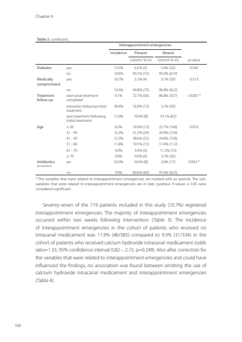 Chapter 6104Table 2. continued.Interappointment emergenciesIncidence Present Absentcolumn % (n) column % (n) p-valueDiabetes yes 13.5% 6.5% (5) 5.0% (32) 0.582 no 10.6% 93.5% (72) 95.0% (610)Medically compromisedyes 16.7% 5.2% (4) 3.1% (20) 0.313 no 10.5% 94.8% (73) 96.9% (622)Treatment follow-uproot canal treatment completed9.1% 72.7% (56) 86.8% (557) <0.001 *extraction following initial treatment39.4% 16.9% (13) 3.1% (20)quit treatment following initial treatment11.0% 10.4% (8) 10.1% (65)Age ≤ 30 8.2% 16.9% (13) 22.7% (146) 0.05331 - 40 15.2% 31.2% (24) 20.9% (134)41 - 50 12.2% 28.6% (22) 24.6% (158)51 - 60 11.8% 19.5% (15) 17.4% (112)61 - 70 4.0% 3.9% (3) 11.2% (72)≥ 70 0.0% 0.0% (0) 3.1% (20)Antibiotics (pre-operative)yes 32.0% 10.4% (8) 2.6% (17) 0.003 *no 9.9% 89.6% (69) 97.4% (625)* The variables that were related to interappointment emergencies are marked with an asterisk. The sub,variables that were related to interappointment emergencies are in italic typeface. P-values ≤ 0.05 were considered significant.Seventy-seven of the 719 patients included in this study (10.7%) registered interappointment emergencies. The majority of interappointment emergencies occurred within two weeks following intervention (Table 3). The incidence of interappointment emergencies in the cohort of patients who received no intracanal medicament was 11.9% (46/385) compared to 9.3% (31/334) in the cohort of patients who received calcium hydroxide intracanal medicament (odds ratio=1.33, 95% confidence interval 0.82 – 2.15; p=0.249). Also after correction for the variables that were related to interappointment emergencies and could have influenced the findings, no association was found between omitting the use of calcium hydroxide intracanal medicament and interappointment emergencies (Table 4). Annemarie Baaij.indd 104 28-06-2023 12:26