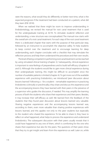 Chapter 7118were the reasons, what would they do differently or better next time, what is the expected prognosis if the treatment had been conducted on a patient, what did they learn (ESE 2018).When we realized that there might be room to improve understanding in Endodontology, we revised the manual for root canal treatment that is used for the undergraduate training at ACTA. To stimulate students’ reflection and understanding, a new structure was conceptualized. The manual now starts with the overall aim of a root canal treatment. For each step of the root canal treatment there is a dedicated chapter that starts with the purpose of that particular step, followed by an instruction to accomplish the objective safely. To help students to keep control over the treatment and to encourage learning for deep understanding, each chapter concludes with a checklist that may stimulate the reflection process and help them understand the procedure and their own results.The level of being competent in performing root canal treatment can be reached by using simulated clinical training (chapter 2). Subsequently, clinical experience is important to raise feelings of preparedness and to build self-efficacy (chapters 4 and 5). Although the students would like to gain more clinical experience during their undergraduate training, this might be difficult to accomplish since the number of available patients is limited (chapter 4). To get more out of the available experience with practicing Endodontics, we introduced ‘peer discussion about lessons learned’: following a – for a student – remarkable experience in practicing Endodontics (clinically or preclinically), they share and discuss this experience and the accompanying lessons they have learned with their peers in the presence of a supervisor who guides the discussion, if needed. This may amplify the learning process of both the students who share their experiences and their peers. Besides, it may increase their self-efficacy as well. We learned from the feedback of the students that they found peer discussion about lessons learned very valuable. Sharing negative experiences and the accompanying lessons learned was, according to them, even more valuable than sharing positive experiences with lessons learned, and this applies not only to the peer students but especially to the student who shared the experience. To be able to share it, they have to reflect on what happened, what helps to process the experience and understand Endodontics. The subsequent discussion with their peers usually reveals that it could have happened to any one of them, which is comforting for the one who shares their experience but also for the peers. The questions of their peers show that they try to get insight and learn from the experience as well. Later on, while Annemarie Baaij.indd 118 28-06-2023 12:26