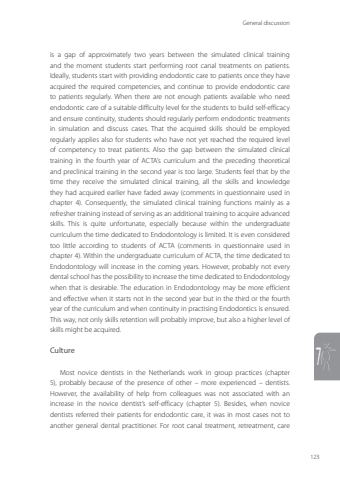 General discussion1237is a gap of approximately two years between the simulated clinical training and the moment students start performing root canal treatments on patients. Ideally, students start with providing endodontic care to patients once they have acquired the required competencies, and continue to provide endodontic care to patients regularly. When there are not enough patients available who need endodontic care of a suitable difficulty level for the students to build self-efficacy and ensure continuity, students should regularly perform endodontic treatments in simulation and discuss cases. That the acquired skills should be employed regularly applies also for students who have not yet reached the required level of competency to treat patients. Also the gap between the simulated clinical training in the fourth year of ACTA’s curriculum and the preceding theoretical and preclinical training in the second year is too large. Students feel that by the time they receive the simulated clinical training, all the skills and knowledge they had acquired earlier have faded away (comments in questionnaire used in chapter 4). Consequently, the simulated clinical training functions mainly as a refresher training instead of serving as an additional training to acquire advanced skills. This is quite unfortunate, especially because within the undergraduate curriculum the time dedicated to Endodontology is limited. It is even considered too little according to students of ACTA (comments in questionnaire used in chapter 4). Within the undergraduate curriculum of ACTA, the time dedicated to Endodontology will increase in the coming years. However, probably not every dental school has the possibility to increase the time dedicated to Endodontology when that is desirable. The education in Endodontology may be more efficient and effective when it starts not in the second year but in the third or the fourth year of the curriculum and when continuity in practising Endodontics is ensured. This way, not only skills retention will probably improve, but also a higher level of skills might be acquired. Culture Most novice dentists in the Netherlands work in group practices (chapter 5), probably because of the presence of other – more experienced – dentists. However, the availability of help from colleagues was not associated with an increase in the novice dentist’s self-efficacy (chapter 5). Besides, when novice dentists referred their patients for endodontic care, it was in most cases not to another general dental practitioner. For root canal treatment, retreatment, care Annemarie Baaij.indd 123 28-06-2023 12:26