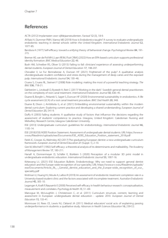 Chapter 7138ReferencesACTA (2012) Implantaten voor vijfdejaarsstudenten. Factaal 12 (3), 18-9. Al Raisi H, Dummer PMH, Vianna ME (2019) How is Endodontics taught? A survey to evaluate undergraduate endodontic teaching in dental schools within the United Kingdom. International Endodontic Journal 52, 1077-85. Bandura A (1977) Self-efficacy: toward a unifying theory of behavioral change. Psychological Review 84, 191-215.Bremer AE, van de Pol MHJ, Laan RFJM, Fluit CRMG (2022) How an EPA-based curriculum supports professional identity formation. BMC Medical Education 22, 48. Bush HM, Schreiber RS, Oliver SJ (2013) Failing to fail: clinicians’ experience of assessing underperforming dental students. European Journal of Dental Education 17, 198-207. Chevalier V, Le Fur Bonnabesse A, Duncan HF (2021) Frightened of the pulp? A qualitative analysis ofundergraduate student confidence and stress during the management of deep caries and the exposed pulp. International Endodontic Journal 54, 130–46.Cruess S, Cruess RL, Steinert Y (2008) Role modeling: making the most of a powerful teaching strategy. The BMJ 336, 718-21.Dahlström L, Lindwall O, Rystedt H, Reit C (2017) ‘Working in the dark’: Swedish general dental practitioners on the complexity of root canal treatment. International Endodontic Journal 50, 636–45. Duane B, Borglin L, Pekarski S, Saget S, Duncan HF (2020) Environmental sustainability in endodontics. A life cycle assessment (LCA) of a root canal treatment procedure. BMC Oral Health 20, 348. Duane B, Dixon J, Ambibola G, et al. (2021) Embedding environmental sustainability within the modern dental curriculum- Exploring current practice and developing a shared understanding. European Journal of Dental Education 25, 541-9. Duffy K (2003) Failing students: A qualitative study of factors that influence the decisions regarding the assessment of students’ competence to practice. Glasgow, United Kingdom: Caledonian Nursing and Midwifery Research Centre, Glasgow Caledonian University.ESE (2013) Undergraduate curriculum guidelines for endodontology. International Endodontic Journal 46, 1105-14.ESE (2018) ESE/ADEE Position Statement. Assessment of undergraduate dental students. URL https://www.es-e.eu/fileadmin/uploads/ese/Documents/ESE_ADEE_Education_Position_statement_2018.pdfField JC, Cowpe JG, Walmsley AD (2017) The graduating European dentist: a new undergraduate curriculum framework. European Journal of Dental Education 21 (Suppl. 1), 2-10. Gist M, Mitchell T (1992) Self-efficacy: a theoretical analysis of its determinants and malleability. The Academy of Management Review 17, 183-211.Hanafi A, Donnermeyer D, Schäfer E, Bürklein S (2020) Perception of a modular 3D print model in undergraduate endodontic education. International Endodontic Journal 53, 1007-16. Kirkevang L-L (2021) ESE Education Bulletin. Endodontology: Why we need to support general dentist education and the Europe-wide recognition of our speciality. URL https://www.e-s-e.eu/fileadmin/uploads/ese/Documents/Article_llk_-_General_dentist_education_and_the_Europe-wide_recognition_of_our_speciality.pdfKrishnan U, Huang HJ, Moule A, Lalloo R (2019) An assessment of endodontic treatment completion rate in a University-based student clinic and the factors associated with incomplete treatment. Australian Endodontic Journal 45, 305-10.Leganger A, Kraft P, Røysamb E (2000) Perceived self-efficacy in health behaviour research: conceptualisation, measurement and correlates. Psychology & Health 15, 51–69.Manogue M, McLoughlin J, Christersson C, et al. (2011) Curriculum structure, content, learning and assessment in European undergraduate dental education - update 2010. European Journal of Dental Education 15, 133-41.Monrouxe LV, Rees CE, Lewis NJ, Cleland JA (2011) Medical educators’ social acts of explaining passing underperformance in students: a qualitative study. Advances in Health Sciences Education 16, 239-52. Annemarie Baaij.indd 138 28-06-2023 12:26