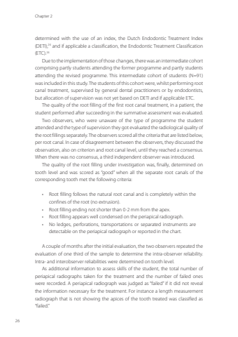 Chapter 226determined with the use of an index, the Dutch Endodontic Treatment Index (DETI),24 and if applicable a classification, the Endodontic Treatment Classification (ETC).24Due to the implementation of those changes, there was an intermediate cohort comprising partly students attending the former programme and partly students attending the revised programme. This intermediate cohort of students (N=91) was included in this study. The students of this cohort were, whilst performing root canal treatment, supervised by general dental practitioners or by endodontists, but allocation of supervision was not yet based on DETI and if applicable ETC.The quality of the root filling of the first root canal treatment, in a patient, the student performed after succeeding in the summative assessment was evaluated.Two observers, who were unaware of the type of programme the student attended and the type of supervision they got evaluated the radiological quality of the root fillings separately. The observers scored all the criteria that are listed below, per root canal. In case of disagreement between the observers, they discussed the observation, also on criterion and root canal level, until they reached a consensus. When there was no consensus, a third independent observer was introduced.The quality of the root filling under investigation was, finally, determined on tooth level and was scored as “good” when all the separate root canals of the corresponding tooth met the following criteria:• Root filling follows the natural root canal and is completely within the confines of the root (no extrusion).• Root filling ending not shorter than 0-2 mm from the apex.• Root filling appears well condensed on the periapical radiograph.• No ledges, perforations, transportations or separated instruments are detectable on the periapical radiograph or reported in the chart.A couple of months after the initial evaluation, the two observers repeated the evaluation of one third of the sample to determine the intra-observer reliability. Intra- and interobserver reliabilities were determined on tooth level.As additional information to assess skills of the student, the total number of periapical radiographs taken for the treatment and the number of failed ones were recorded. A periapical radiograph was judged as “failed” if it did not reveal the information necessary for the treatment. For instance a length measurement radiograph that is not showing the apices of the tooth treated was classified as “failed.”Annemarie Baaij.indd 26 28-06-2023 12:26