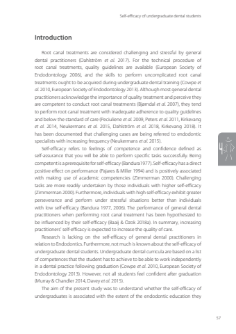Self-efficacy of undergraduate dental students574IntroductionRoot canal treatments are considered challenging and stressful by general dental practitioners (Dahlström et al. 2017). For the technical procedure of root canal treatments, quality guidelines are available (European Society of Endodontology 2006), and the skills to perform uncomplicated root canal treatments ought to be acquired during undergraduate dental training (Cowpe et al. 2010, European Society of Endodontology 2013). Although most general dental practitioners acknowledge the importance of quality treatment and perceive they are competent to conduct root canal treatments (Bjørndal et al. 2007), they tend to perform root canal treatment with inadequate adherence to quality guidelines and below the standard of care (Peciuliene et al. 2009, Peters et al. 2011, Kirkevang et al. 2014, Neukermans et al. 2015, Dahlström et al. 2018, Kirkevang 2018). It has been documented that challenging cases are being referred to endodontic specialists with increasing frequency (Neukermans et al. 2015). Self-efficacy refers to feelings of competence and confidence defined as self-assurance that you will be able to perform specific tasks successfully. Being competent is a prerequisite for self-efficacy (Bandura1977). Self-efficacy has a direct positive effect on performance (Pajares & Miller 1994) and is positively associated with making use of academic competencies (Zimmerman 2000). Challenging tasks are more readily undertaken by those individuals with higher self-efficacy (Zimmerman 2000). Furthermore, individuals with high self-efficacy exhibit greater perseverance and perform under stressful situations better than individuals with low self-efficacy (Bandura 1977, 2006). The performance of general dental practitioners when performing root canal treatment has been hypothesized to be influenced by their self-efficacy (Baaij & Özok 2018a). In summary, increasing practitioners' self-efficacy is expected to increase the quality of care. Research is lacking on the self-efficacy of general dental practitioners in relation to Endodontics. Furthermore, not much is known about the self-efficacy of undergraduate dental students. Undergraduate dental curricula are based on a list of competences that the student has to achieve to be able to work independently in a dental practice following graduation (Cowpe et al. 2010, European Society of Endodontology 2013). However, not all students feel confident after graduation (Murray & Chandler 2014, Davey et al. 2015). The aim of the present study was to understand whether the self-efficacy of undergraduates is associated with the extent of the endodontic education they Annemarie Baaij.indd 57 28-06-2023 12:26
