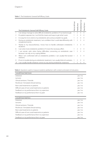 Chapter 460Table 1. The Endodontic General Self-Efficacy Scale.The Endodontic General Self-Efficacy ScaleNot at all trueHardly trueModerately trueExactly true1 I can always manage to solve difficult endodontic problems if I try hard enough. 1 2 3 42 If a patient opposes me, I can find the means and ways to get what I want. 1 2 3 43 It is easy for me to stick to my endodontic aims and accomplish my goals. 1 2 3 44 During an endodontic treatment, I am confident that I could deal efficiently with unexpected events. 1 2 3 45 Thanks to my resourcefulness, I know how to handle unforeseen endodontic situations. 1 2 3 46 I can solve most endodontic problems if I invest the necessary effort. 1 2 3 47 I can remain calm when facing difficulties concerning an endodontic case because I can rely on my coping abilities. 1 2 3 48 When I am confronted with an endodontic problem, I can usually find several solutions. 1 2 3 49 If I am in trouble during an endodontic treatment, I can usually think of a solution. 1 2 3 410 I can usually handle whatever comes my way during endodontic treatment. 1 2 3 4Table 2. Questions used to measure students satisfaction with content and extent of education.I would have had more:Literature yes / no Lectures yes / noClinical seminars / Tutorials yes / noPreclinical / Simulated clinical training yes / noRoot canal treatments on patients yes / noDifficult cases of root canal treatments on patients yes / noFeedback on my performance from my supervisor yes / noFeedback on my performance from my peer yes / noI would have had less: Literature yes / noLectures yes / noClinical seminars / Tutorials yes / noPreclinical / Simulated clinical training yes / noRoot canal treatments on patients yes / noDifficult cases of root canal treatments on patients yes / noFeedback on my performance from my supervisor yes / noFeedback on my performance from my peer yes / noAnnemarie Baaij.indd 60 28-06-2023 12:26