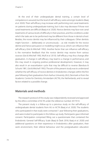 Chapter 578At the end of their undergraduate dental training, a certain level of competence is assured, but the level of self-efficacy varies amongst students (Baaij et al. 2020). Their self-efficacy may increase with performing root canal treatments on patients during undergraduate training, but it also may decrease if those root canal treatments are difficult (Baaij et al. 2020). Novice dentists may face root canal treatments of various levels of difficulty in their practices, and the conditions under which the tasks are to be performed may be different from those in dental school. Besides, the novice dentist may be influenced by their colleagues. Other dentists might function – deliberately or unconsciously – as role models for the novice dentist and hence persuasion or modelling might occur, which can influence their self-efficacy (Gist & Mitchell 1992). Another factor that can influence self-efficacy is the normative feedback that the novice dentist may receive from various sources (Gist & Mitchell 1992, Wulf et al. 2010). Self-efficacy may thus change after graduation. A change in self-efficacy may lead to a change in performance, and this may result in ongoing positive professional development, however, it may also result in an exacerbation cycle that may be difficult to reverse (Bandura & Schunk 1981, Gist & Mitchell 1992). The aim of the present study was to understand whether the self-efficacy of novice dentists in Endodontics changes within the first year following their graduations from Aarhus University (AU), Denmark or from the Academic Centre for Dentistry Amsterdam (ACTA), the Netherlands, and to reveal factors related to a possible change.Materials and methods The research protocol of this study was independently reviewed and approved by the ethics committee of ACTA under the reference number 2017014. The present study is a follow-up to a previous study on the self-efficacy of undergraduate dental students from AU or ACTA (Baaij et al. 2020). The students who participated in that study were contacted 1 year following their graduations, and were invited to participate in this follow-up study. Participants gave informed consent. Participation comprised filling out a questionnaire that contained the Endodontic General Self-Efficacy Scale (Baaij & Özok 2018, Baaij et al. 2020) and additional questions on their experience in Endodontics after graduation, their work environment, their referral behaviour and the postgraduation education Annemarie Baaij.indd 78 28-06-2023 12:26
