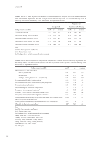 Chapter 582Table 2. Results of linear regression analyses and multiple regression analyses with independent variables from the baseline registration and the change in total self-efficacy score (i.e. total self-efficacy score at follow-up minus total self-efficacy score at baseline) as dependent variable. Adjusted forUnadjusted baseline self-efficacyIndependent variables coeff. se p-value coeff. se p-valueSchool (ref = ACTA) 1.15 1.12 .31 -0.74 0.92 .42Group (ACTA only, ref = standard) -2.33 1.51 .13 -0.19 1.35 .89Number of teeth treated in school -0.23 0.31 .47 0.14 0.25 .58Number of canals treated in school -0.27 0.13 .04 -0.04 0.11 .74Number of molars treated in school -0.79 0.48 .10 -0.27 0.39 .49Note:“coeff.” is the regression coefficient “se” is the standard errorEach independent variable was analysed separately.Table 3. Results of linear regression analyses with independent variables from the follow-up registration and the change in total self-efficacy score (i.e. total self-efficacy score at follow-up minus total self-efficacy score at baseline) as dependent variable. Independent variable coeff. se p-valuePerformed root canal treatmentsPrimary treatment 0.05 0.02 .001Retreatment 0.34 0.20 .09Total (i.e. primary treatment + retreatment) 0.05 0.02 .002Encountered difficulties in diagnosing a 0.10 1.17 .93Encountered difficulties in determining the prognosis a -1.22 1.14 .29Encountered complications a 0.25 1.17 .84Encountered post-operative complaints a 1.87 1.25 .14Frequency of emergency treatment b 1.10 1.17 .35Frequency of consultation following dental trauma c 0.63 1.41 .66Frequency of treatment following dental trauma d 0.58 1.34 .67Colleagues available for help when difficulties were encountered whilst performing root canal treatment e-2.06 1.13 .07Colleagues available to discuss an endodontic case if necessary e -2.75 2.26 .23Materials similar to those at school f -0.07 1.24 .96Note:“coeff.” is the regression coefficient “se” is the standard errorEach independent variable was analysed separately. a rarely, never. Ref = often, sometimes.b weekly, monthly, rarely, never. Ref = daily.c monthly, rarely, never. Ref = daily, weekly.d rarely, never. Ref = daily, weekly, monthly.e sometimes, never. Ref = always.f no. Ref = yes.Annemarie Baaij.indd 82 28-06-2023 12:26