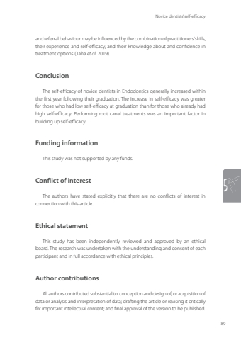 Novice dentists’ self-efficacy895and referral behaviour may be influenced by the combination of practitioners’ skills, their experience and self-efficacy, and their knowledge about and confidence in treatment options (Taha et al. 2019).Conclusion The self-efficacy of novice dentists in Endodontics generally increased within the first year following their graduation. The increase in self-efficacy was greater for those who had low self-efficacy at graduation than for those who already had high self-efficacy. Performing root canal treatments was an important factor in building up self-efficacy.Funding informationThis study was not supported by any funds.Conflict of interestThe authors have stated explicitly that there are no conflicts of interest in connection with this article.Ethical statement This study has been independently reviewed and approved by an ethical board. The research was undertaken with the understanding and consent of each participant and in full accordance with ethical principles.Author contributionsAll authors contributed substantial to: conception and design of, or acquisition of data or analysis and interpretation of data; drafting the article or revising it critically for important intellectual content; and final approval of the version to be published.Annemarie Baaij.indd 89 28-06-2023 12:26
