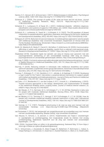 Chapter 138Santos, H. C., Varnum, M. E., & Grossmann, I. (2017). Global increases in individualism. Psychological science, 28(9), 1228-1239. https://doi.org/10.1177/0956797617700622 Schalock, R. L. (2004). The concept of quality of life: what we know and do not know. Journal of Intellectual Disability Research, 48(3), 203-216. https://doi.org/10.1111/j.1365-2788.2003.00558.x Schalock, R. L., Luckasson, R., & Tasse%u0301, M. J. (2021). Intellectual disability : definition, diagnosis, classification, and systems of supports (12th edition. ed.). AAIDD. https://public.ebookcentral.proquest.com/choice/publicfullrecord.aspx?p=6467029 Schalock, R. L., Luckasson, R., Tass%u00e9, M. J., & Shogren, K. A. (2022). The IDD paradigm of shared citizenship: its operationalization, application, evaluation, and shaping for the future. Intellectual and developmental disabilities, 60(5), 426-443. https://doi.org/10.1352/1934-9556-60.5.426 Schippers, B. (2019). Reduction of coercive measures: A multidisciplinary approach in care for people with intellectual disabilities Vrije Universiteit Amsterdam, Department of Clinical Child and Family Studies]. WorldCat.org. Amsterdam. https://research.vu.nl/en/publications/d8082bbc6abe-4e9b-b764-e84265fef964Smith, M., Manduchi, B., Burke, %u00c9., Carroll, R., McCallion, P., & McCarron, M. (2020). Communication difficulties in adults with intellectual disability: results from a national cross-sectional study. Research in Developmental Disabilities, 97, 103557. https://doi.org/10.1016/j.ridd.2019.103557 Staatsblad (2018). Houdende regels ten aanzien van zorg en dwang voor personen met een psychogeriatische aandoening of een verstandelijke handicap (Wet Zorg en Dwang psychogeriatische en verstandelijk gehandicapte cli%u00ebnten). http://www.dwangindezorg.nlSturmey, P. (2009). It is time to reduce and safely eliminate restrictive behavioural practices. Journal of Applied Research in Intellectual Disabilities, 22(2), 105-110. https://doi.org/10.1111/j.1468-3148.2008.00476.x Sturmey, P. (2018). Reducing restraint in individuals with intellectual disabilities and autism spectrum disorders: a systematic review group interventions. Advances in neurodevelopmental disorders, 2(4), 375-390. https://doi.org/10.1007/s41252-018-0088-yTournier, T., Embregts, P. J. C. M., Hendriks, A. H. C., Jahoda, A., & Hastings, R. P. (2020). Developing a logic model for the Triple-C intervention: a practice-derived intervention to support people with intellectual disability and challenging behavior. Journal of Policy and Practice in Intellectual Disabilities, 17(4), 297-307. https://doi.org/10.1111/jppi.12333 van Calis, J. F. E., Bevelander, K. E., van der Cruijsen, A. W. C., Leusink, G. L., & Naaldenberg, J. (2023). Toward inclusive approaches in the design, development, and implementation of eHealth in the intellectual disability sector: scoping review. Journal of medical Internet research, 25, e45819. https://doi.org/10.2196/45819 Van der Meulen, A. P. S., Hermsen, M. A., & Embregts, P. J. C. M. (2018a). Restraints in daily care for people with moderate intellectual disabilities. Nursing Ethics, 25(1), 54-68. https://doi.org/10.1177/0969733016638141 van der Meulen, A. P. S., Taminiau, E. F., Hertogh, C. M. P., & Embregts, P. J. C. M. (2018b). How do people with moderate intellectual disability evaluate restrictions in daily care? International Journal of Developmental Disabilities, 64(3), 158-165. https://doi.org/10.1080/20473869.2018.1442182 Van Gennep, A. T. G. (1997). Paradigma-verschuiving in de visie op zorg voor mensen met een verstandelijke handicap. s.n.]. https://doi.org/10.26481/spe.19970228ag (Maastricht University)van Rootselaar, F. (2019). Het perspectief van zorgprofessionals op onvrijwillige zorg voor mensen met een verstandelijke beperking. [Master thesis]. Vrije Universiteit Amsterdam. Van Wouwe, H., Simons, L., & Janssen, C. (2013). Implementatie van Triple-C: veranderingen in vaardigheden en probleemgedrag. Een longitudinale studie bij cli%u00ebnten met ernstig probleemgedrag. Nederlands Tijdschrift voor de Zorg aan mensen met verstandelijke beperkingen, 1, 31-43. VGN. (2024). Factsheet feiten en cijfers in de gehandicaptenzorg. Retrieved May 10 from https://www.vgn.nl/feiten-en-cijfers-de-gehandicaptenzorgVis, C., Schuurmans, J., Aouizerate, B., Atipei Craggs, M., Batterham, P., B%u00fchrmann, L., Calear, A., Cerga Pashoja, A., Christensen, H., Dozeman, E., Duedal Pedersen, C., Ebert, D. D., Etzelmueller,