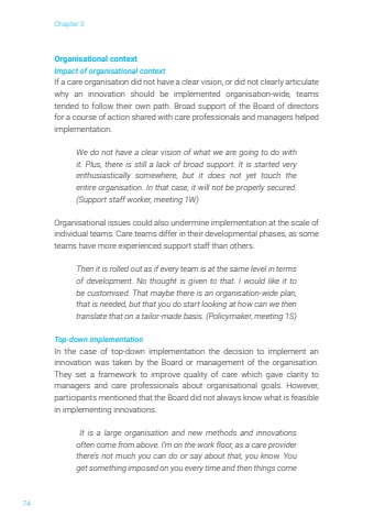 Chapter 374Organisational context Impact of organisational context If a care organisation did not have a clear vision, or did not clearly articulate why an innovation should be implemented organisation-wide, teams tended to follow their own path. Broad support of the Board of directors for a course of action shared with care professionals and managers helped implementation. We do not have a clear vision of what we are going to do with it. Plus, there is still a lack of broad support. It is started very enthusiastically somewhere, but it does not yet touch the entire organisation. In that case, it will not be properly secured. (Support staff worker, meeting 1W)Organisational issues could also undermine implementation at the scale of individual teams. Care teams differ in their developmental phases, as some teams have more experienced support staff than others. Then it is rolled out as if every team is at the same level in terms of development. No thought is given to that. I would like it to be customised. That maybe there is an organisation-wide plan, that is needed, but that you do start looking at how can we then translate that on a tailor-made basis. (Policymaker, meeting 1S) Top-down implementationIn the case of top-down implementation the decision to implement an innovation was taken by the Board or management of the organisation. They set a framework to improve quality of care which gave clarity to managers and care professionals about organisational goals. However, participants mentioned that the Board did not always know what is feasible in implementing innovations. It is a large organisation and new methods and innovations often come from above. I%u2019m on the work floor, as a care provider there%u2019s not much you can do or say about that, you know. You get something imposed on you every time and then things come