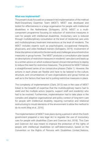 Chapter 492What was implemented?The present study focused on a research-led implementation of the method Multi-Disciplinary Expertise Team (MDET). MDET was developed and tested for effectiveness in a large organisation for people with intellectual disabilities in the Netherlands (Schippers, 2019). MDET is a multicomponent programme focusing on reduction of restrictive measures in care for people with intellectual disabilities. Involuntary care is reduced through multidisciplinary consultation at the level of residential care units and multidisciplinary treatment interventions at the level of residents. The MDET includes experts such as psychologists, occupational therapists, physicians, and video feedback trainers (Schippers, 2019). Involvement of these disciplines is tailored to the demands and challenges around restrictive measures in group homes. The MDET produces a consultation plan based on descriptions of restrictive measures in residents%u2019 care plans and leads up to a written advice on which evidence-based clinical interventions to deploy to reduce the need for restrictive measures. The protocol for MDET follows a straightforward series of six consecutive phases (Table 1). However, the actions in each phase are flexible and have to be tailored to the culture, structure, and circumstances of care organisations and group homes as well as to the factors that have led to putting restrictive measures in place. The complexity of implementation (Clark, 2013) was in the case of MDET linked to the breadth of expertise that the multidisciplinary teams had to wield and the multiple actors (experts, support staff and residents) who had to be involved. Furthermore, implementation had to take place in the complex and adaptive organisational and policy context of long-term care for people with intellectual disability, requiring normative and relational restructuring to mould elements of the environment to allow the method to do its work (May et al., 2016).The implementation of MDET took place during a period in which the Dutch government prepared a new legal Act to regulate the use of involuntary care for people with disabilities (Care and Coercion Act, 2018). This Care and Coercion Act was meant to improve the protection of the rights of people with intellectual disabilities on self-determination, based on the Convention on the Rights of Persons with Disabilities (United_Nations,