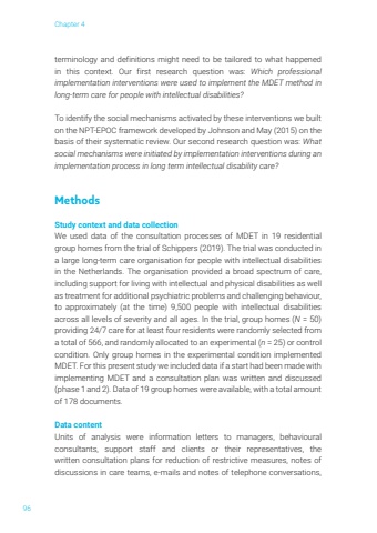 Chapter 496terminology and definitions might need to be tailored to what happened in this context. Our first research question was: Which professional implementation interventions were used to implement the MDET method in long-term care for people with intellectual disabilities?To identify the social mechanisms activated by these interventions we built on the NPT-EPOC framework developed by Johnson and May (2015) on the basis of their systematic review. Our second research question was: What social mechanisms were initiated by implementation interventions during an implementation process in long term intellectual disability care? MethodsStudy context and data collection We used data of the consultation processes of MDET in 19 residential group homes from the trial of Schippers (2019). The trial was conducted in a large long-term care organisation for people with intellectual disabilities in the Netherlands. The organisation provided a broad spectrum of care, including support for living with intellectual and physical disabilities as well as treatment for additional psychiatric problems and challenging behaviour, to approximately (at the time) 9,500 people with intellectual disabilities across all levels of severity and all ages. In the trial, group homes (N = 50) providing 24/7 care for at least four residents were randomly selected from a total of 566, and randomly allocated to an experimental (n = 25) or control condition. Only group homes in the experimental condition implemented MDET. For this present study we included data if a start had been made with implementing MDET and a consultation plan was written and discussed (phase 1 and 2). Data of 19 group homes were available, with a total amount of 178 documents. Data content Units of analysis were information letters to managers, behavioural consultants, support staff and clients or their representatives, the written consultation plans for reduction of restrictive measures, notes of discussions in care teams, e-mails and notes of telephone conversations,