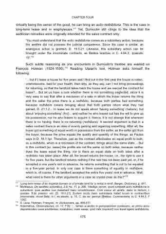 An example of the first is Balduinus in his interpretation of D. 21.1.61. This text holds the seller liable for price reduction without giving clues about his knowledge of the servitude on the sold land.154 According to Balduinus, however, the seller in the text must have been unfamiliar with the servitude's existence. Otherwise, he could have been sued for all loss on the grounds of fraud (dolus). Balduinus' reading cannot be sustained by the text's literal wordings, which do not say anything about the seller's state of mind. They only mention that the seller is liable for price reduction in the event a buyer of his land has been evicted because of a servitude. Perhaps the seller knew about it, perhaps not. Balduinus' interpretation seems to have been inspired by a wish to streamline the liability for latent defects and encumbrances. This feeling is corroborated by his reference to D. 19.1.13pr.
