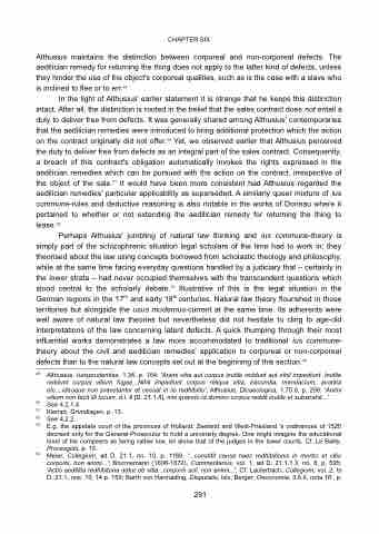 Nevertheless, a tendency to simplify contract law by extensively interpreting the Corpus iuris is already shimmering through in the works of Althusius. Concerning this section's topic, this scholar again provides an example of someone with one leg still in pre- natural law style ius commune and the other already, though somewhat hesitatingly, over the fence on natural law grounds. Rather reluctant in applying the aedilician remedies to all defects, be they movables or immovables, corporeal or incorporeal, Althusius is outspoken regarding the question whether the aedilician remedies can be extended to lease: