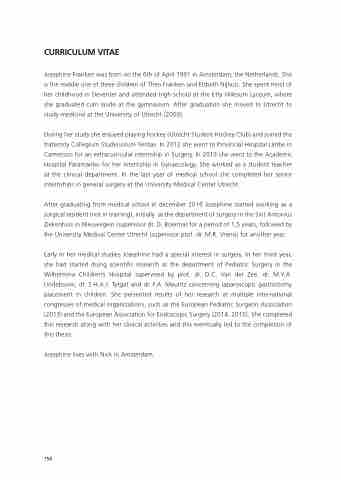 Early in her medical studies Josephine had a special interest in surgery. In her third year, she had started doing scientific research at the department of Pediatric Surgery in the Wilhelmina Children’s Hospital supervised by prof. dr. D.C. Van der Zee, dr. M.Y.A. Lindeboom, dr. S.H.A.J. Tytgat and dr. F.A. Mauritz concerning laparoscopic gastrostomy placement in children. She persented results of her research at multiple international congresses of medical organizations, such as the European Pediatric Surgeon Association (2013) and the European Association for Endoscopic Surgery (2014, 2015). She completed this research along with her clinical activities and this eventually led to the completion of this thesis.