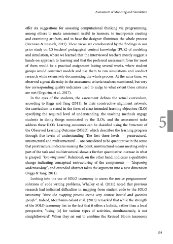 offer six suggestions for assessing computational thinking via programming, among others to make assessment useful to learners, to incorporate creating and examining artifacts, and to have the designer illuminate the whole process (Brennan & Resnick, 2012). These views are corroborated by the findings in our prior study on CS teachers’ pedagogical content knowledge (PCK) of modeling and simulation, where we learned that the interviewed teachers mostly suggest a hands-on approach to learning and that the preferred assessment form for most of them would be a practical assignment lasting several weeks, where student groups would construct models and use them to run simulations and conduct research while extensively documenting the whole process. At the same time, we observed a great diversity in the assessment criteria teachers mentioned, but very few corresponding quality indicators used to judge to what extent these criteria are met (Grgurina et al., 2017).