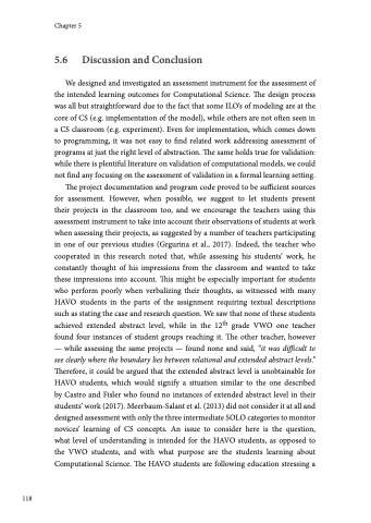 The project documentation and program code proved to be sufficient sources for assessment. However, when possible, we suggest to let students present their projects in the classroom too, and we encourage the teachers using this assessment instrument to take into account their observations of students at work when assessing their projects, as suggested by a number of teachers participating in one of our previous studies (Grgurina et al., 2017). Indeed, the teacher who cooperated in this research noted that, while assessing his students’ work, he constantly thought of his impressions from the classroom and wanted to take these impressions into account. This might be especially important for students who perform poorly when verbalizing their thoughts, as witnessed with many HAVO students in the parts of the assignment requiring textual descriptions such as stating the case and research question. We saw that none of these students achieved extended abstract level, while in the 12th grade VWO one teacher found four instances of student groups reaching it. The other teacher, however — while assessing the same projects — found none and said, “it was difficult to see clearly where the boundary lies between relational and extended abstract levels.” Therefore, it could be argued that the extended abstract level is unobtainable for HAVO students, which would signify a situation similar to the one described by Castro and Fisler who found no instances of extended abstract level in their students’ work (2017). Meerbaum-Salant et al. (2013) did not consider it at all and designed assessment with only the three intermediate SOLO categories to monitor novices’ learning of CS concepts. An issue to consider here is the question, what level of understanding is intended for the HAVO students, as opposed to the VWO students, and with what purpose are the students learning about Computational Science. The HAVO students are following education stressing a
