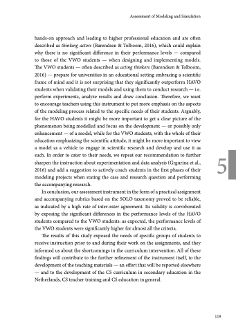 In conclusion, our assessment instrument in the form of a practical assignment and accompanying rubrics based on the SOLO taxonomy proved to be reliable, as indicated by a high rate of inter-rater agreement. Its validity is corroborated by exposing the significant differences in the performance levels of the HAVO students compared to the VWO students: as expected, the performance levels of the VWO students were significantly higher for almost all the criteria.