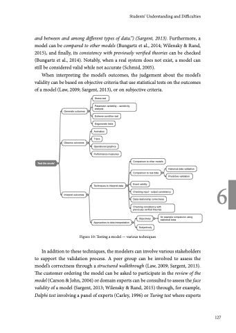 In addition to these techniques, the modelers can involve various stakeholders to support the validation process. A peer group can be involved to assess the model’s correctness through a structured walkthrough (Law, 2009; Sargent, 2013). The customer ordering the model can be asked to participate in the review of the model (Carson & John, 2004) or domain experts can be consulted to assess the face validity of a model (Sargent, 2013; Wilensky & Rand, 2015) through, for example, Delphi test involving a panel of experts (Carley, 1996) or Turing test where experts