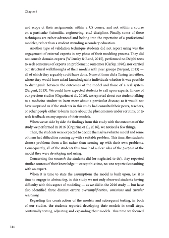 Another type of validation technique students did not report using was the engagement of external experts in any phase of their modeling process. They did not consult domain experts (Wilensky & Rand, 2015), performed no Delphi tests to seek consensus of experts on problematic outcomes (Carley, 1996), nor carried out structural walkthroughs of their models with peer groups (Sargent, 2013) — all of which they arguably could have done. None of them did a Turing test either, where they would have asked knowledgeable individuals whether it was possible to distinguish between the outcomes of the model and those of a real system (Sargent, 2013). We could have expected students to call upon experts. In one of our previous studies (Grgurina et al., 2016), we reported about our student talking to a medicine student to learn more about a particular disease; so it would not have surprised us if the students in this study had consulted their peers, teachers, or other people either to learn more about the phenomenon under scrutiny, or to seek feedback on any aspects of their models.