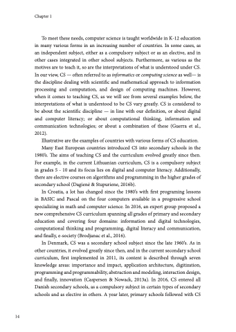 To meet these needs, computer science is taught worldwide in K-12 education in many various forms in an increasing number of countries. In some cases, as an independent subject, either as a compulsory subject or as an elective, and in other cases integrated in other school subjects. Furthermore, as various as the motives are to teach it, so are the interpretations of what is understood under CS. In our view, CS — often referred to as informatics or computing science as well— is the discipline dealing with scientific and mathematical approach to information processing and computation, and design of computing machines. However, when it comes to teaching CS, as we will see from several examples below, the interpretations of what is understood to be CS vary greatly. CS is considered to be about the scientific discipline — in line with our definition, or about digital and computer literacy; or about computational thinking, information and communication technologies; or about a combination of these (Guerra et al., 2012).