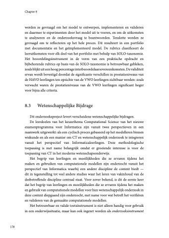 worden ze gevraagd om het model te ontwerpen, implementeren en valideren en daarmee te experimenten door het model uit te voeren, en om de uitkomsten te analyseren en de onderzoeksvraag te beantwoorden. Tenslotte worden ze gevraagd om te reflecteren op het hele proces. Dit resulteert in een portfolio met documentatie en het geïmplementeerd model. De rubrics classificeert de leeruitkomsten voor elk deel van het portfolio met behulp van SOLO-taxonomie. Het beoordelingsinstrument in de vorm van een praktische opdracht en bijbehorende rubrics op basis van de SOLO-taxonomie is betrouwbaar gebleken, zoals blijkt uit een hoog percentage interbeoordelaarsovereenkomsten. De validiteit ervan wordt bevestigd doordat de significante verschillen in prestatieniveaus van de HAVO leerlingen ten opzichte van de VWO leerlingen zichtbaar werden: zoals verwacht waren de prestatieniveaus van de VWO leerlingen significant hoger voor bijna alle criteria.