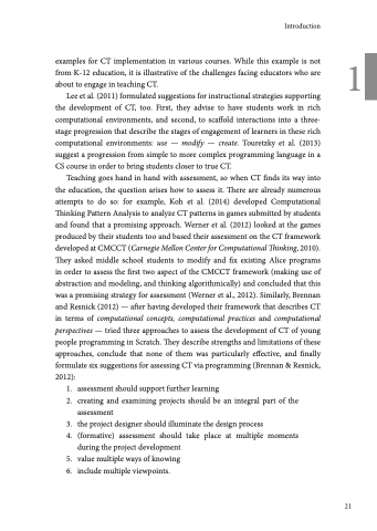Teaching goes hand in hand with assessment, so when CT finds its way into the education, the question arises how to assess it. There are already numerous attempts to do so: for example, Koh et al. (2014) developed Computational Thinking Pattern Analysis to analyze CT patterns in games submitted by students and found that a promising approach. Werner et al. (2012) looked at the games produced by their students too and based their assessment on the CT framework developed at CMCCT (Carnegie Mellon Center for Computational Thinking, 2010). They asked middle school students to modify and fix existing Alice programs in order to assess the first two aspect of the CMCCT framework (making use of abstraction and modeling, and thinking algorithmically) and concluded that this was a promising strategy for assessment (Werner et al., 2012). Similarly, Brennan and Resnick (2012) — after having developed their framework that describes CT in terms of computational concepts, computational practices and computational perspectives — tried three approaches to assess the development of CT of young people programming in Scratch. They describe strengths and limitations of these approaches, conclude that none of them was particularly effective, and finally formulate six suggestions for assessing CT via programming (Brennan & Resnick, 2012):