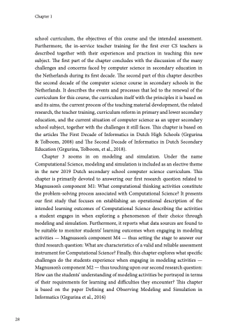 school curriculum, the objectives of this course and the intended assessment. Furthermore, the in-service teacher training for the first ever CS teachers is described together with their experiences and practices in teaching this new subject. The first part of the chapter concludes with the discussion of the many challenges and concerns faced by computer science in secondary education in the Netherlands during its first decade. The second part of this chapter describes the second decade of the computer science course in secondary schools in the Netherlands. It describes the events and processes that led to the renewal of the curriculum for this course, the curriculum itself with the principles it is based on and its aims, the current process of the teaching material development, the related research, the teacher training, curriculum reform in primary and lower secondary education, and the current situation of computer science as an upper secondary school subject, together with the challenges it still faces. This chapter is based on the articles The First Decade of Informatics in Dutch High Schools (Grgurina & Tolboom, 2008) and The Second Decade of Informatics in Dutch Secondary Education (Grgurina, Tolboom, et al., 2018).