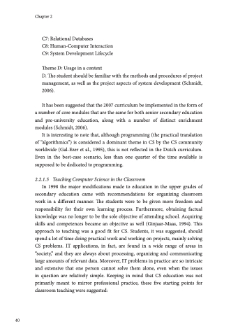 In 1998 the major modifications made to education in the upper grades of secondary education came with recommendations for organizing classroom work in a different manner. The students were to be given more freedom and responsibility for their own learning process. Furthermore, obtaining factual knowledge was no longer to be the sole objective of attending school. Acquiring skills and competences became an objective as well (Ginjaar-Maas, 1994). This approach to teaching was a good fit for CS. Students, it was suggested, should spend a lot of time doing practical work and working on projects, mainly solving CS problems. IT applications, in fact, are found in a wide range of areas in “society,” and they are always about processing, organizing and communicating large amounts of relevant data. Moreover, IT problems in practice are so intricate and extensive that one person cannot solve them alone, even when the issues in question are relatively simple. Keeping in mind that CS education was not primarily meant to mirror professional practice, these five starting points for classroom teaching were suggested: