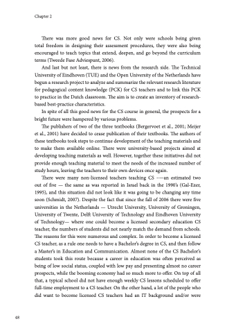 There were many non-licensed teachers teaching CS –—an estimated two out of five — the same as was reported in Israel back in the 1990’s (Gal-Ezer, 1995), and this situation did not look like it was going to be changing any time soon (Schmidt, 2007). Despite the fact that since the fall of 2006 there were five universities in the Netherlands — Utrecht University, University of Groningen, University of Twente, Delft University of Technology and Eindhoven University of Technology— where one could become a licensed secondary education CS teacher, the numbers of students did not nearly match the demand from schools. The reasons for this were numerous and complex. In order to become a licensed CS teacher, as a rule one needs to have a Bachelor’s degree in CS, and then follow a Master’s in Education and Communication. Almost none of the CS Bachelor’s students took this route because a career in education was often perceived as being of low social status, coupled with low pay and presenting almost no career prospects, while the booming economy had so much more to offer. On top of all that, a typical school did not have enough weekly CS lessons scheduled to offer full-time employment to a CS teacher. On the other hand, a lot of the people who did want to become licensed CS teachers had an IT background and/or were