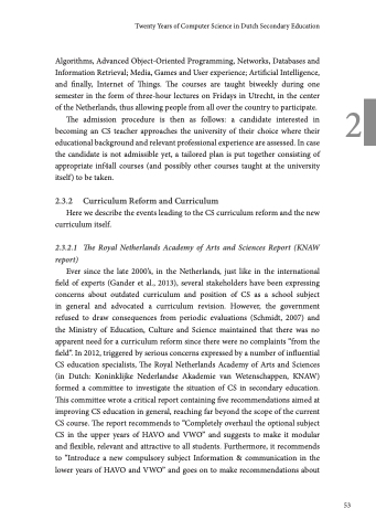 Ever since the late 2000’s, in the Netherlands, just like in the international field of experts (Gander et al., 2013), several stakeholders have been expressing concerns about outdated curriculum and position of CS as a school subject in general and advocated a curriculum revision. However, the government refused to draw consequences from periodic evaluations (Schmidt, 2007) and the Ministry of Education, Culture and Science maintained that there was no apparent need for a curriculum reform since there were no complaints “from the field”. In 2012, triggered by serious concerns expressed by a number of influential CS education specialists, The Royal Netherlands Academy of Arts and Sciences (in Dutch: Koninklijke Nederlandse Akademie van Wetenschappen, KNAW) formed a committee to investigate the situation of CS in secondary education. This committee wrote a critical report containing five recommendations aimed at improving CS education in general, reaching far beyond the scope of the current CS course. The report recommends to “Completely overhaul the optional subject CS in the upper years of HAVO and VWO” and suggests to make it modular and flexible, relevant and attractive to all students. Furthermore, it recommends to “Introduce a new compulsory subject Information & communication in the lower years of HAVO and VWO” and goes on to make recommendations about