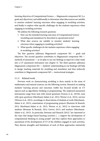 objectives. The second question contributes to Magnusson’s component M4 — methods of assessment — as we plan to use our findings as input for a later study into a CT assessment instrument (see chapter 5). The third question addresses Magnusson’s component M2 — students’ understanding as our findings will help to design teaching materials for modeling and simulation and thus indirectly contribute to Magnusson’s component M3 — instructional strategies.