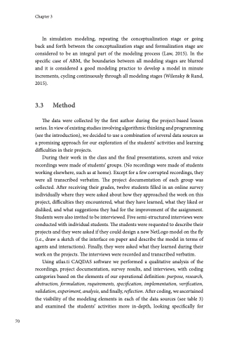 During their work in the class and the final presentations, screen and voice recordings were made of students’ groups. (No recordings were made of students working elsewhere, such as at home). Except for a few corrupted recordings, they were all transcribed verbatim. The project documentation of each group was collected. After receiving their grades, twelve students filled in an online survey individually where they were asked about how they approached the work on this project, difficulties they encountered, what they have learned, what they liked or disliked, and what suggestions they had for the improvement of the assignment. Students were also invited to be interviewed. Five semi-structured interviews were conducted with individual students. The students were requested to describe their projects and they were asked if they could design a new NetLogo model on the fly (i.e., draw a sketch of the interface on paper and describe the model in terms of agents and interactions). Finally, they were asked what they learned during their work on the projects. The interviews were recorded and transcribed verbatim.