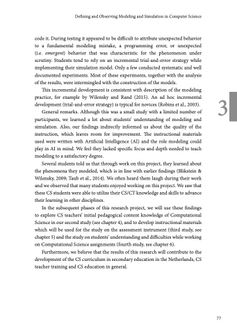 code it. During testing it appeared to be difficult to attribute unexpected behavior to a fundamental modeling mistake, a programming error, or unexpected (i.e. emergent) behavior that was characteristic for the phenomenon under scrutiny. Students tend to rely on an incremental trial-and-error strategy while implementing their simulation model. Only a few conducted systematic and well documented experiments. Most of these experiments, together with the analysis of the results, were intermingled with the construction of the models.