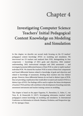 This chapter is based on the paper Grgurina, N., Barendsen, E., Suhre, C., van Veen, K., & Zwaneveld, B. (2017). Investigating informatics teachers’ initial pedagogical content knowledge on modeling and simulation. In International Conference on Informatics in Schools: Situation, Evolution, and Perspectives (pp. 65-76). Springer, Cham.