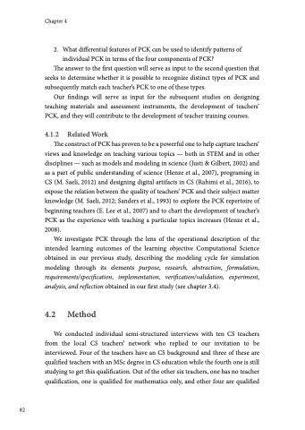 The construct of PCK has proven to be a powerful one to help capture teachers’ views and knowledge on teaching various topics — both in STEM and in other disciplines — such as models and modeling in science (Justi & Gilbert, 2002) and as a part of public understanding of science (Henze et al., 2007), programing in CS (M. Saeli, 2012) and designing digital artifacts in CS (Rahimi et al., 2016), to expose the relation between the quality of teachers’ PCK and their subject matter knowledge (M. Saeli, 2012; Sanders et al., 1993) to explore the PCK repertoire of beginning teachers (E. Lee et al., 2007) and to chart the development of teacher’s PCK as the experience with teaching a particular topics increases (Henze et al., 2008).