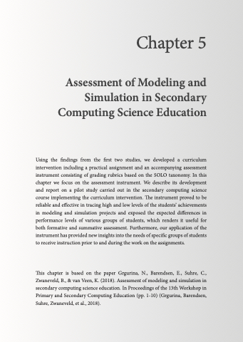 This chapter is based on the paper Grgurina, N., Barendsen, E., Suhre, C., Zwaneveld, B., & van Veen, K. (2018). Assessment of modeling and simulation in secondary computing science education. In Proceedings of the 13th Workshop in Primary and Secondary Computing Education (pp. 1-10) (Grgurina, Barendsen, Suhre, Zwaneveld, et al., 2018).