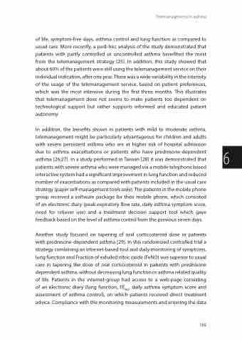of life, symptom-free days, asthma control and lung function as compared to usual care. More recently, a post-hoc analysis of the study demonstrated that patients with partly controlled or uncontrolled asthma benefited the most from the telemanagement strategy [25]. In addition, this study showed that about 60% of the patients were still using the telemanagement service on their individual indication, after one year. There was a wide variability in the intensity of the usage of the telemanagement service, based on patient preferences, which was the most intensive during the first three months. This illustrates that telemanagement does not seems to make patients too dependent on technological support but rather supports informed and educated patient autonomy.