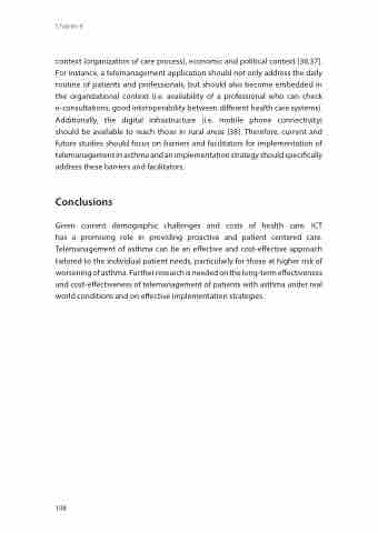 context (organization of care process), economic and political context [36;37]. For instance, a telemanagement application should not only address the daily routine of patients and professionals, but should also become embedded in the organizational context (i.e. availability of a professional who can check e-consultations, good interoperability between different health care systems). Additionally, the digital infrastructure (i.e. mobile phone connectivity) should be available to reach those in rural areas [38]. Therefore, current and future studies should focus on barriers and facilitators for implementation of telemanagement in asthma and an implementation strategy should specifically address these barriers and facilitators.