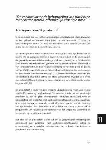Dit proefschrift is gedreven door klinische uitdagingen die reeds lang erkend zijn [14;15], maar nog steeds relevant. Ondanks het feit dat het een wereldwijd probleem is, zijn er geen internationale richtlijnen ontwikkeld voor de behandeling van patiënten met corticosteroïd-afhankelijk astma. Daarnaast is er geen consensus over de meest effectieve manier om de dosering van systemische corticosteroïden af te bouwen, noch een protocol dat de zorgverlener kan helpen bij het opstellen van een uitgebreid behandelplan toegespitst op de individuele patiënt.