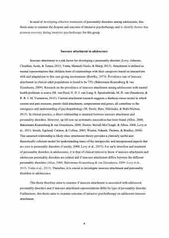 This thesis therefore aims to examine if insecure attachment is associated with adolescent personality disorders and if insecure attachment representations differ by type of personality disorder. Furthermore, this thesis aims to examine outcome of intensive psychotherapy on adolescent insecure attachment.