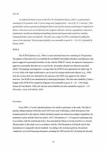 The SCID-II (Spitzer et al., 1990) is a semi-structured interview consisting of 134 questions. The purpose of this interview is to establish the ten DSM-IV personality disorders, and depressive and passive-aggressive personality disorders. In line with the DSM-IV criteria, the depressive and passive- aggressive personality disorders are covered by the ‘personality disorder not otherwise specified’ (NOS). The language and diagnostic coverage make the SCID-II most appropriate for adults (age 18 or over), while with slight modification it can be used for younger adolescents (Spitzer et al., 1990). Only the sections that were indicated by the outcome of the VKP were applied in the clinical interview. The SCID-II was administered by trained psychologists. The inter-rater reliability (Cohen’s Kappa) of the SCID-II for categorical diagnoses was reasonable to good (k = .61 -1.00) (Seqal, Hersen, & Van Hasselt, 1994), and the test-retest reliability was also reasonable to good (k = .63) (Weertman, Arntz, & Kerkhofs, 2000).
