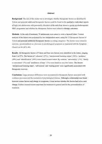 Results: All therapeutic factors of Yalom and four new factors were identified in the letters, ranging from 1 to 97%. The factors of ‘cohesion’ (97%), ‘interpersonal learning output’ (94%), ‘guidance’ (98%) and ‘identification’ (94%) were found in most letters. By contrast, ‘universality’ (1%), ‘family re-enactment’ (3%) and ‘instillation of hope’ (1%) were found in very few letters. The factors ‘interpersonal learning input’, ‘self-esteem’ and ‘turning point’ were significantly associated with therapeutic recovery.