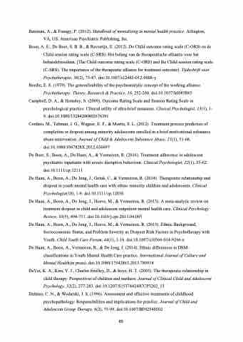 De Haan, A., Boon, A., De Jong, J., Geluk, C., & Vermeiren, R. (2014). Therapeutic relationship and dropout in youth mental health care with ethnic minority children and adolescents. Clinical Psychologist(18), 1-9. doi:10.1111/cp.12030
