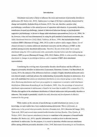 While studies on the outcome of psychotherapy on adult attachment are scarce, to our knowledge, no such studies have been conducted among adolescents. This is unfortunate, as adolescence is the period when personality disorders (Feenstra et al., 2011; Rossouw & Fonagy, 2012; Tyrer et al., 2015) and several major mental health disorders develop (Kessler, Chiu, Demler, & Walters, 2005). Since insecure attachment is known to contribute to the emergence of mental health disorders (M. Steele et al., 2015), specific information is needed on how to alleviate insecure attachment in adolescents. For this purpose, it is crucial to determine whether insecure attachment differs among different personality disorders (Allen, 2008; Bakermans-Kranenburg & van IJzendoorn,