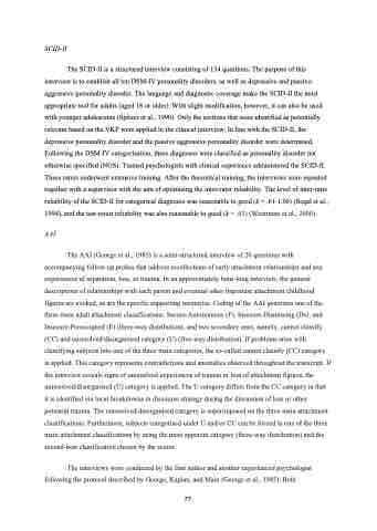 The SCID-II is a structured interview consisting of 134 questions. The purpose of this interview is to establish all ten DSM-IV personality disorders, as well as depressive and passive- aggressive personality disorder. The language and diagnostic coverage make the SCID-II the most appropriate tool for adults (aged 18 or older). With slight modification, however, it can also be used with younger adolescents (Spitzer et al., 1990). Only the sections that were identified as potentially relevant based on the VKP were applied in the clinical interview. In line with the SCID-II, the depressive personality disorder and the passive aggressive personality disorder were determined. Following the DSM-IV categorisation, these diagnoses were classified as personality disorder not otherwise specified (NOS). Trained psychologists with clinical experience administered the SCID-II. These raters underwent extensive training. After the theoretical training, the interviews were repeated together with a supervisor with the aim of optimising the inter-rater reliability. The level of inter-rater reliability of the SCID-II for categorical diagnoses was reasonable to good (k = .61-1.00) (Seqal et al., 1994), and the test-retest reliability was also reasonable to good (k = .63) (Weertman et al., 2000).