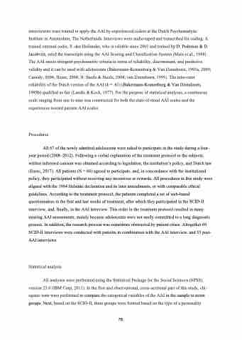 All analyses were performed using the Statistical Package for the Social Sciences (SPSS), version 23.0 (IBM Corp, 2011). In the first and observational, cross-sectional part of this study, chi- square tests were performed to compare the categorical variables of the AAI in the sample to norm groups. Next, based on the SCID-II, three groups were formed based on the type of a personality
