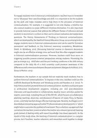 To engage students more in historical contextualization, teachers have to remember not to “showcase” their own knowledge and skills. It is important to let the students do the work and make mistakes and to help them in the processes of historical contextualization. For example, it is suggested to not only display a timeline but also instruct students to create (different) timelines themselves. It is also important to provide historical sources that address the different frames of reference and ask students to reconstruct a context on their own to answer evaluative and explanatory questions. The History Assessments of Thinking on historical contextualization, which are developed by the Stanford History Education Group, are promising tools to engage students more in historical contextualization and can be used for formative assessment and feedback on this historical reasoning competency (Breakstone, Smith, & Wineburg, 2013). Discussing historical sources in classroom discussions might also be an effective strategy since we found that this often engaged students in historical contextualization processes. Moreover, teachers could focus more on triggering possible present-oriented perspectives among students. Presenting the past as strange (e.g., child labor and the poor working conditions in the 18th century compared to the daily life of a child currently) could promote awareness of the differences and connections between the past and present (Huijgen & Holthuis, 2015; Seixas & Morton, 2013).