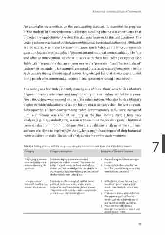 No anomalies were noticed by the participating teachers. To examine the progress of the students in historical contextualization, a coding scheme was constructed that provided the opportunity to review the students’ answers to the test questions. The coding scheme was based on literature on historical contextualization (e.g., Endacott & Brooks, 2013; Hartmann & Hasselhorn, 2008; Lee & Ashby, 2001). Since our research question focused on the display of presentism and historical contextualization before and after an intervention, we chose to work with these two coding categories (see Table 26). It is possible that an answer received a “presentism” and “contextualized” code when the student, for example, answered that slavery was a phenomenon in the 19th century (using chronological context knowledge) but that it was stupid to not bring people who committed atrocities to trial (present-oriented perspective).