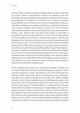 historical context knowledge, including knowledge about chronology, before they can perform historical contextualization. Reisman and Wineburg (2008) also stressed the importance of background knowledge for the performance of historical contextualization. To reconstruct the historical context, students and teachers can use different frames of reference such as the chronological frame of reference, spatial frame of reference, or social frame of reference (e.g., De Keyser & Vandepitte, 1998; Pontecorvo & Girardet, 1993; Van Boxtel & Van Drie, 2012). The chronological frame includes knowledge of time and period, significant events, and developments (Dawson, 2009; Wilschut, 2012). The spatial frame focuses on knowledge of (geographical) locations and scale (Havekes et al., 2012). The social frame includes not only knowledge of human behavior and the social conditions of life but also knowledge of socio-economic, socio-cultural, and socio-political developments (Van Boxtel & Van Drie, 2004). To reconstruct the historical context, teachers and students should explore the different frames of reference. For example, in previous research, we found that most students who used and combined different types of knowledge (e.g., chronological, spatial, economic, political, and cultural knowledge) obtained higher scores on a historical contextualization task than students who used a single type of knowledge (Huijgen, Van Boxtel, Van de Grift, & Holthuis, 2017). Teachers could use different sources to build the different frames of knowledge, such as movies (Marcus, 2005; Metzger, 2012), written documents, objects, and images (Fasulo, Girardet, & Pontecorvo, 1998; Van Drie & Van Boxtel, 2008).
