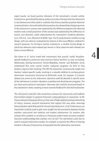 Van Hover et al. (2012) noted that instruments that provide “useful discipline- specific feedback to preservice (and inservice) history teachers” (p. 604) are lacking. Additionally, Darling-Hammond, Amrein-Beardsley, Haertel, and Rothstein (2012) emphasized that most current teacher evaluation programs do little to help teachers improve their teaching. The FAT-HC instrument could provide insight into teachers’ subject-specific needs, resulting in a valuable addition to existing generic observation instruments (Grossman & McDonald, 2008). For example, if a teacher obtains low scores on the instrument, attention could be devoted to specific items of the instrument in teacher education or professional development programs. The pre-observation and post-observation interviews also could be structured based on the instrument’s items, resulting in more concrete feedback for the observed teacher.